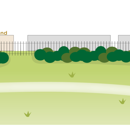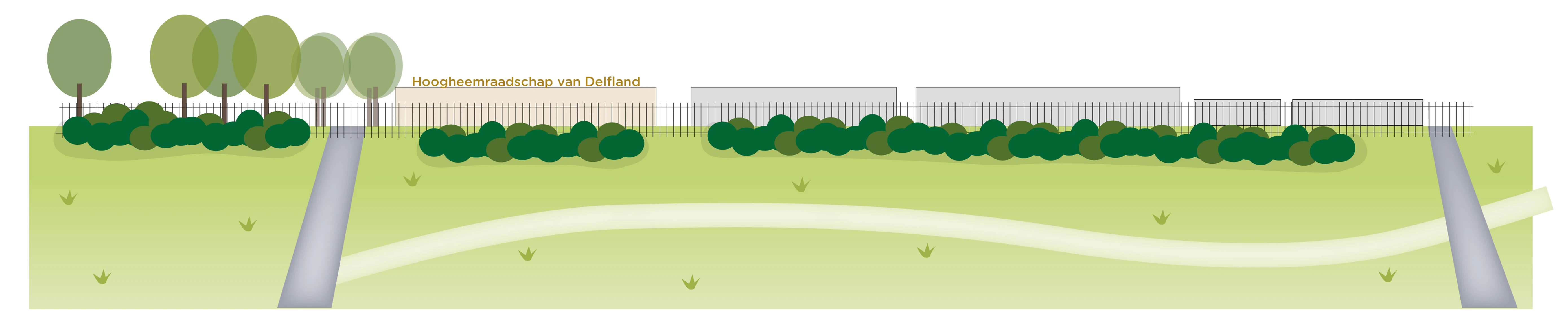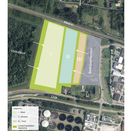 Rond het hele zuiveringsterrein besteden we veel aandacht aan een goede landschappelijke inpassing en aangaan van een relatie met de directe omgeving. Voor het ontwerpen van de randen van het zuiveringsterrein kwamen we tot vier verschillende sferen, passend bij de aangrenzende omgeving. Gelaagd groen (van bosrand tot aan watergangen) met hoogwaardige en biodiverse beplanting aan de kant van het Volksbos; open en wijds aan de zijde van de Maassluissedijk; een dubbele bomenrij als afscheiding tussen de waterzuivering en het wandelpad aan de kant van de metro; en groen met ruimte voor zicht op de architectuur van de gebouwen aan de zijde van het bedrijventerrein. Zo ontstaat rond de zuivering een gevarieerd en landschappelijk gebied, dat aantrekkelijk uitziet en toegankelijk is voor voetgangers.