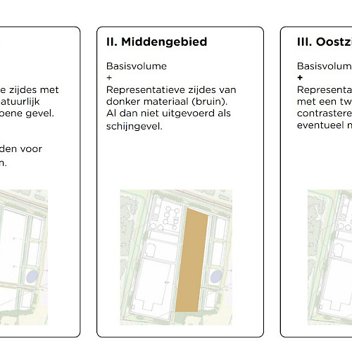 In het westelijke deel van het zuiveringsterrein, de zijde naast het Volksbos, krijgen gebouwen minimaal één gevel die bekleed is met natuurlijk materiaal of groen. In het middelste deel van het terrein houden we rekening met de doorkijkjes en zichtlijnen vanuit de voorbijrijdende metro. Hier krijgen gebouwen representatieve gevels van donker materiaal, bij voorkeur bruin gekleurd. De oostkant, grenzend aan het bedrijventerrein, huisvest de kantoren, werkplaatsen en opslaggebouwen van het hoogheemraadschap. Aan deze kant maken we de gebouwen familie van elkaar door ze allemaal een duurzaam industrieel karakter te geven via de gekozen materialen en kleuren. Het kantoor springt er als enige uit; de plek waar we Hoogheemraadschap Delfland zichtbaar en herkenbaar maken als zuiveraar van ons afvalwater.