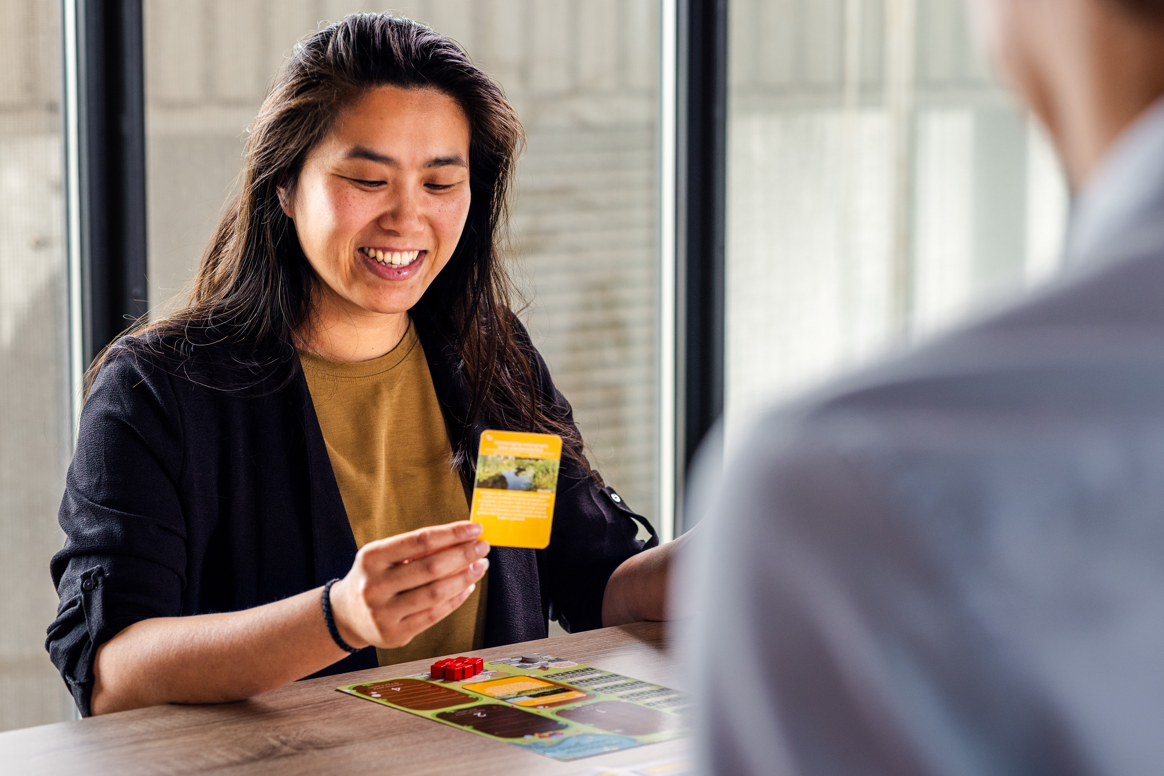 Het Bodemspel is een coöperatief spel, waarbij de spelers moeten samenwerken. Het spel levert de beste resultaten op als de andere spelers ook betrokkenen rond jouw werkomgeving zijn. Bijvoorbeeld een parkbeheerder en ondernemers op het bedrijvenpark, beleidsadviseurs van een gemeente samen met een gebiedsontwikkelaar, of collega’s waarmee je je gebouw wil vergroenen. Door het spel gezamenlijk te spelen delen jullie niet alleen kennis en ervaringen, maar ook meningen en wensen met elkaar. Om daarmee tot een door jullie allemaal gedragen uitkomst te komen.