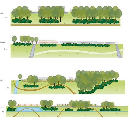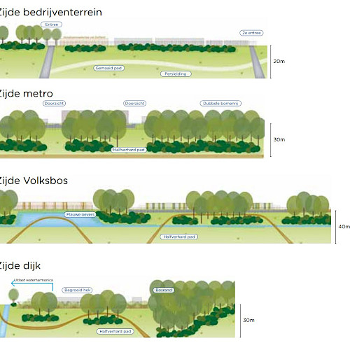 Rond het hele zuiveringsterrein besteden we veel aandacht aan een goede landschappelijke inpassing en aangaan van een relatie met de directe omgeving. Voor het ontwerpen van de randen van het zuiveringsterrein kwamen we tot vier verschillende sferen, passend bij de aangrenzende omgeving. Gelaagd groen (van bosrand tot aan watergangen) met hoogwaardige en biodiverse beplanting aan de kant van het Volksbos; open en wijds aan de zijde van de Maassluissedijk; een dubbele bomenrij als afscheiding tussen de waterzuivering en het wandelpad aan de kant van de metro; en groen met ruimte voor zicht op de architectuur van de gebouwen aan de zijde van het bedrijventerrein. Zo ontstaat rond de zuivering een gevarieerd en landschappelijk gebied, dat aantrekkelijk uitziet en toegankelijk is voor voetgangers.
