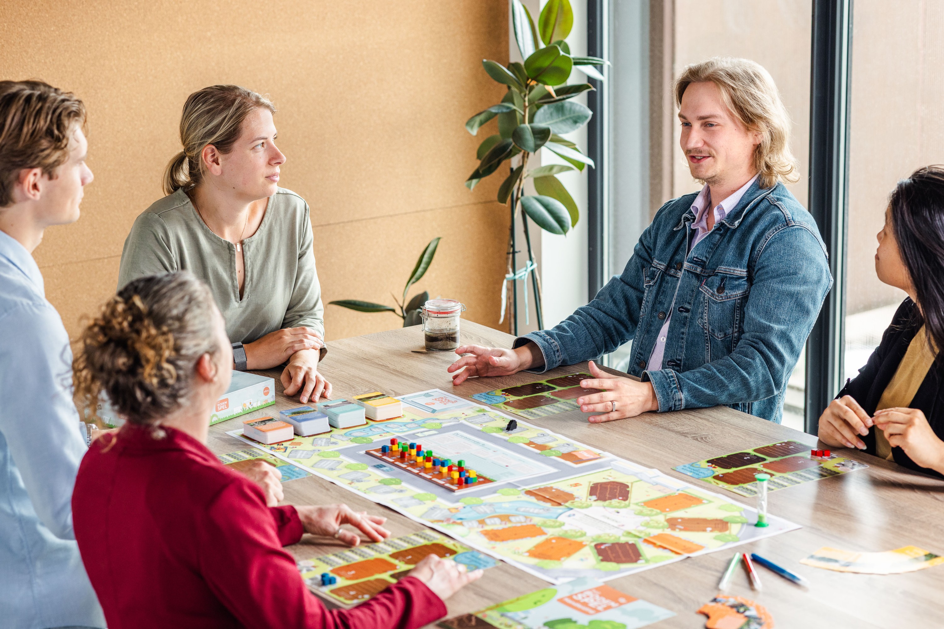 Het Bodemspel is een coöperatief spel waarbij de spelers, onder begeleiding van onze experts, moeten samenwerken om de finish te bereiken. Het spel levert de beste resultaten op als de andere spelers ook betrokkenen rond jouw werkomgeving zijn. Bijvoorbeeld een parkbeheerder en ondernemers op het bedrijvenpark, beleidsadviseurs van een gemeente samen met een gebiedsontwikkelaar, of collega’s waarmee je je gebouw wil vergroenen. Door het spel gezamenlijk te spelen delen jullie niet alleen kennis en ervaringen, maar ook meningen en wensen met elkaar. Om daarmee tot een door jullie allemaal gedragen uitkomst te komen.